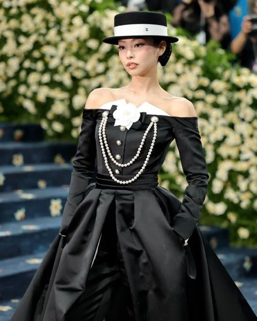 Jennie Kim of BLACKPINK captivated with a minimalist white power suit that nodded to '70s icons. Her sleek look was both modern and nostalgic, embodying the theme's celebration of tailored elegance .